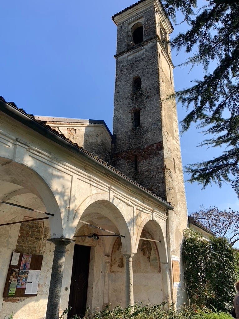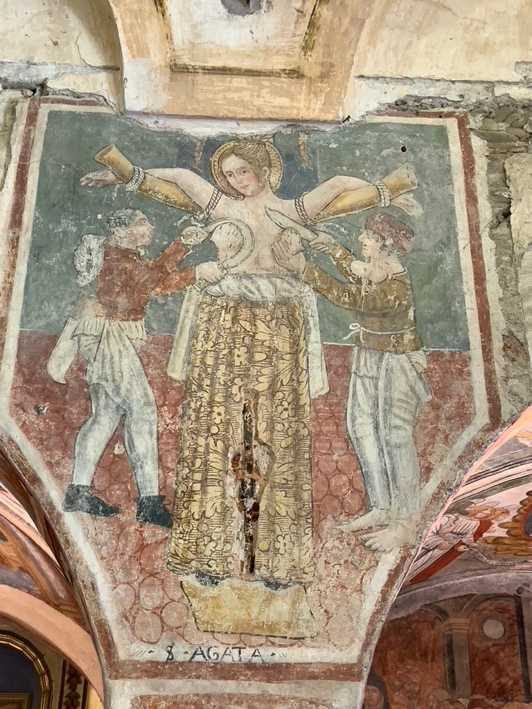 This is Sant’Agata — Saint Agatha — and to modern eyes the image is violent and stark. The obvious question, standing there in the quiet of this small Piedmontese church, is: why? Nothing in a church was placed by accident. Why this saint? Why this size? Why is the first thing you see?