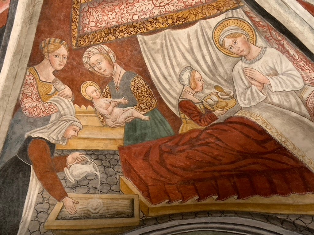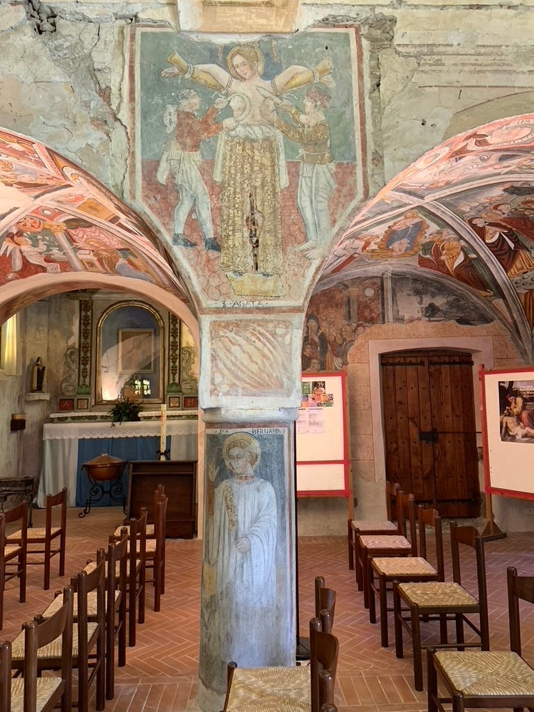 It is worth pausing on what this connection meant. Sant’Agata was, by long tradition, the patron of weavers — linked to the loom through a legend in which she outwitted a persistent suitor by weaving during the day and unraveling her work at night, like Penelope, until he gave up. The women of this valley would have known that. When they came to this church and looked at that fresco, they were looking at someone who was their patron of their work, witness to their specific suffering, a woman who could understand what no physician named and no husband saw.