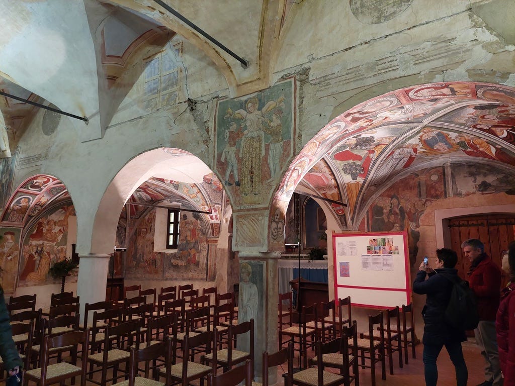The size of the fresco tells you how serious the problem was. The position tells you it was not tucked away, not private, not shameful. It was the first thing you saw when you entered. A declaration, painted in the best available hand, in the year 1515, in a small church on a road in Piedmont.
