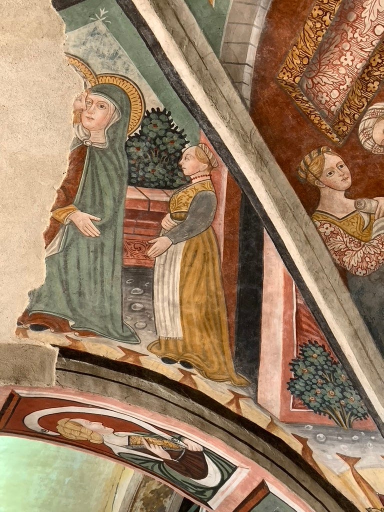 The frescoes date from 1515 — there is a date, painted right into the plaster, as if someone wanted to make sure we remembered when they were there. A painter’s workshop, skilled and unhurried, covered these walls with the world they knew: the clothes people wore, the way women tied their headdresses, the cut of men’s trousers. It is a photograph made with pigment and patience. A whole society preserved in lime.